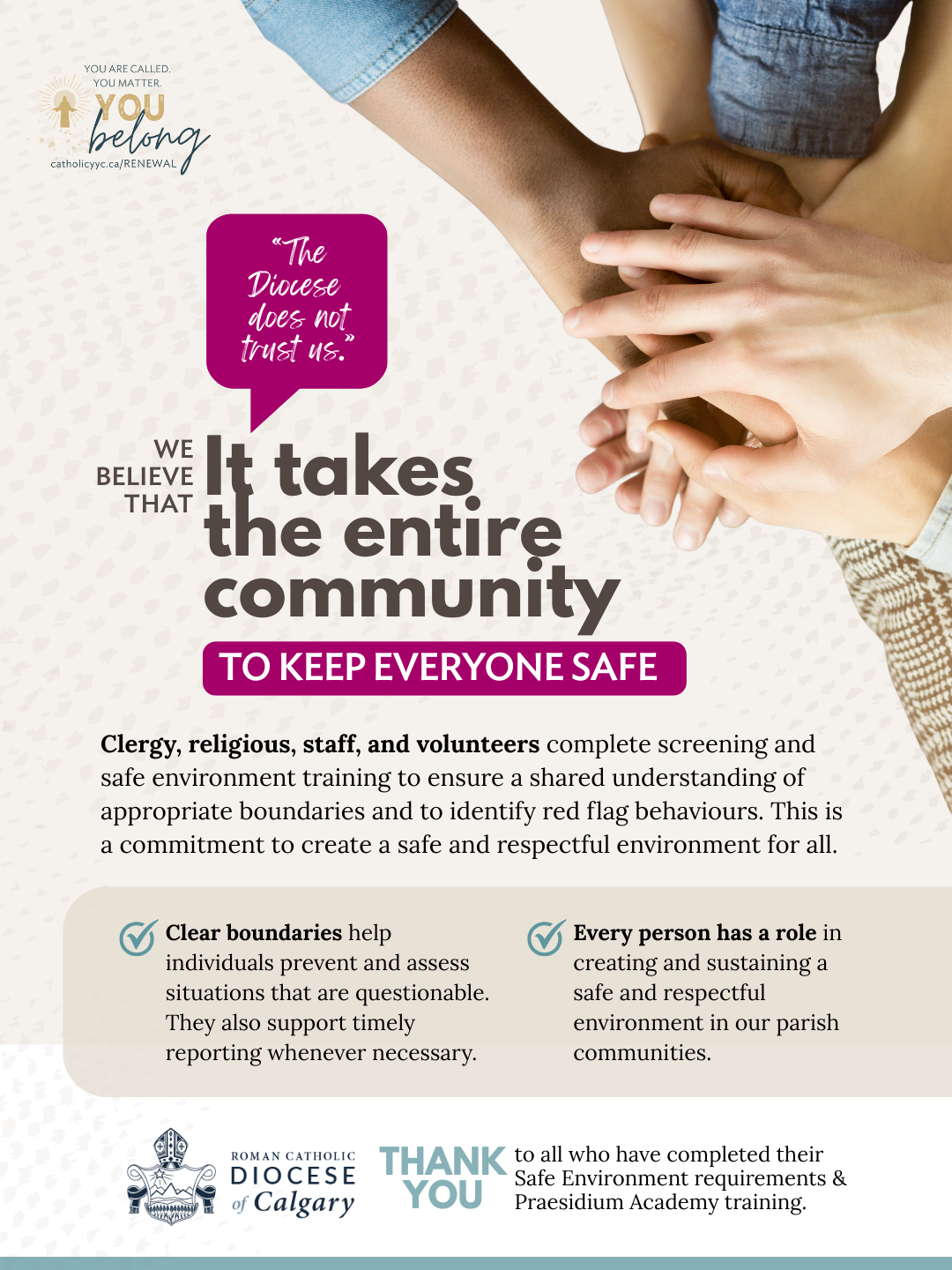 Our Diocesan Volunteer Screening Program oversees this important work conducting the appropriate checks and balances to ensure a safe environment for all those engaged in a variety of important ministries in our parish. If you have any questions about Volunteer Screening, please contactColleen McKelvey, Volunteer Screening Coordinator or Brenda Kuhn, Ministry Support at 403-278-7556.