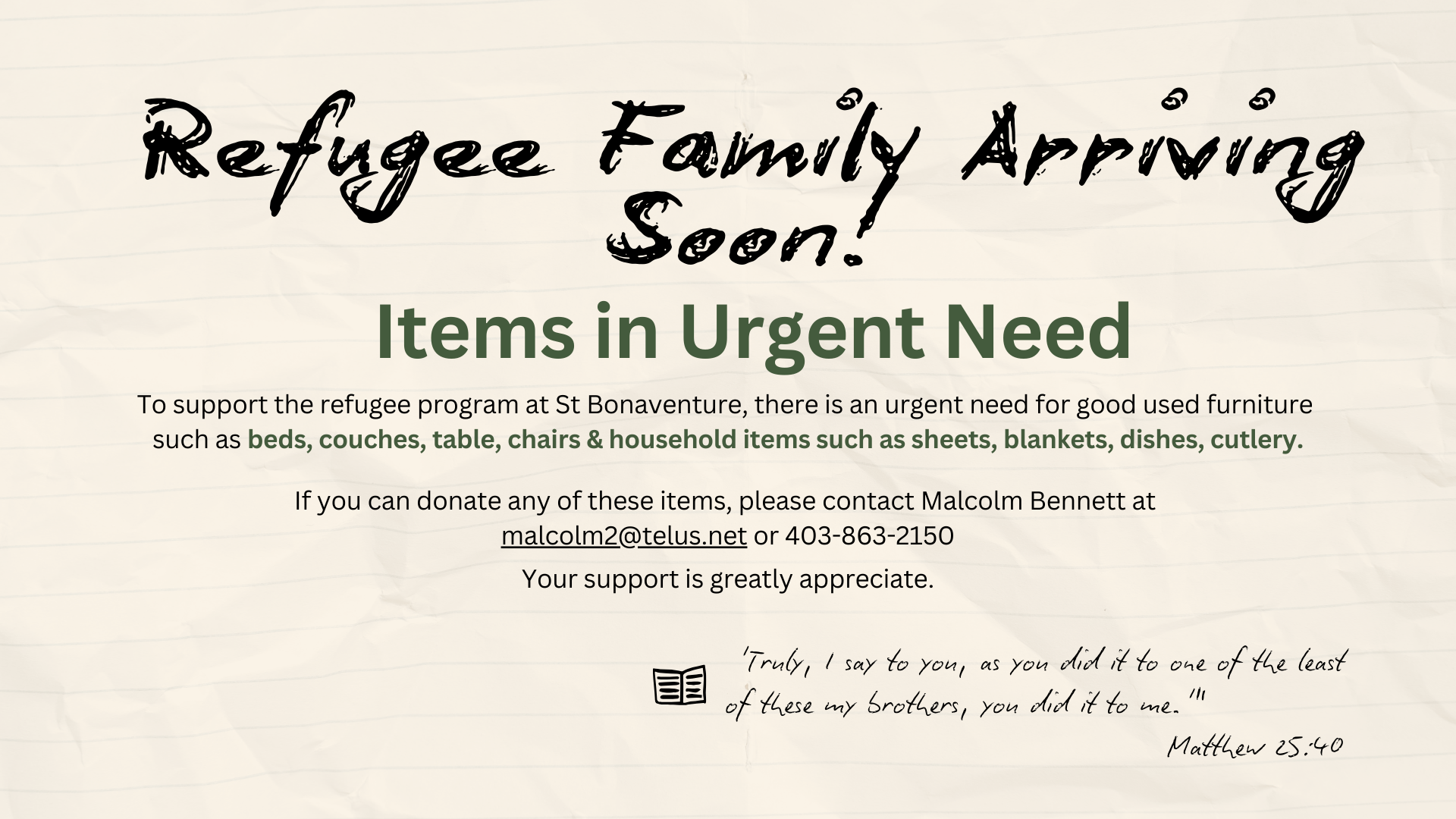 Our parish will soon be sponsoring a new refugee family the first week of February. To support the refugee program at St Bonaventure, there is an urgent need for good used furniture such as beds, couches, table, chairs & household items such as sheets, blankets, dishes, cutlery.