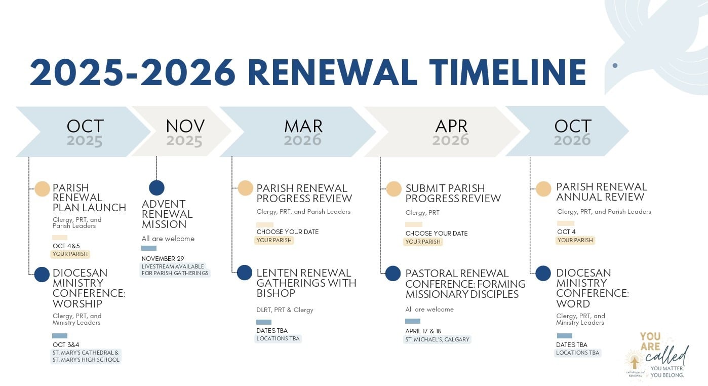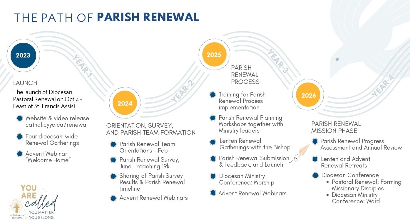 We encourage you to share the Bishop’s message of Renewal with friends and family. The QR code on the tall Pastoral Renewal banner we display in the church will direct you to the video. Remember, you are called, you matter, and you belong. We have begun the third year of our Parish Renewal journey. On this occasion, Bishop McGrattan encourages us to enter more deeply into a personal conversion to Christ and to commence our Parish Renewal missions. Listen to his full message at catholicyyc.ca/renewal